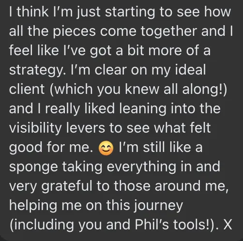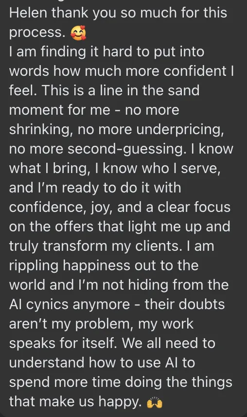 Six weeks of direct access to my insight and eyes - the same clarity work clients pay £1k/hour for - guiding you through identity alignment, message calibration, and strategic positioning.